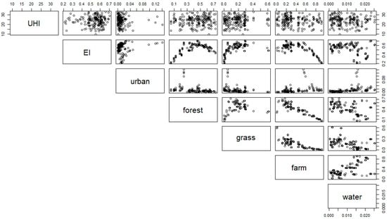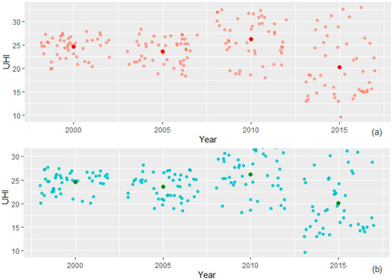 The temperature range in the hot season (five months) of 2000, 2005, 2010 and 2015 in 47 cities was calculated separately (Figure 3). There are two different ways of map presentation, where one is to try to emphasize the temporal variation and the other is to emphasize the spatial variation. This study used Jenks Natural Breaks Classification to optimize the class range for better visual effect and ensure the spatial variation. The level of the UHI increased gradually between 2000 and 2015; however, no clear spatial pattern can be identified. This is because a spatial process normally contains not only the covariate effects, but also spatial or even spatio-temporal autocorrelated random effects, which normally can lead to an incorrect interpretation of the covariate effects. For example, as indicated by Figure 4, no clear correlation pattern can be identified from the scatterplots between UHI and land cover based on the information collected in the 47 cities between 2000 and 2015. This can be partly attributed to the mixed, residual autocorrelated spatio-temporal structure and the covariate effects. Therefore, to accurately estimate the impact of land use change on UHI, the residual autocorrelated spatio-temporal structure needs to be determined first.