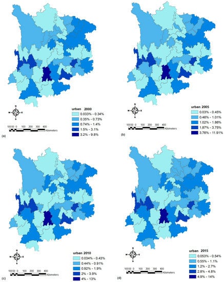 The proportion of urban land in different cities in four different years: (a) 2000; (b) 2005; (c) 2010; and (d) 2015.
