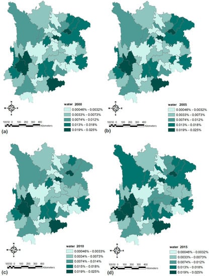 Figure 6 shows the spatio-temporal pattern of water bodies in the study area, which was calculated from the small/big patches (presenting both rivers and lakes) in the land use data, and which was distributed in both in cities or the countryside. The overall proportions did not change significantly between 2000 and 2015, and the largest variation comes from 2015, in which the proportion of water bodies increases in some cities.