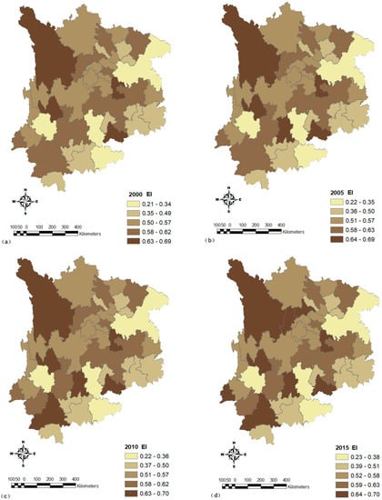 The variation of land use mix quantified by the Entropy Index (EI) in four different years: (a) 2000; (b) 2005; (c) 2010; and (d) 2015.