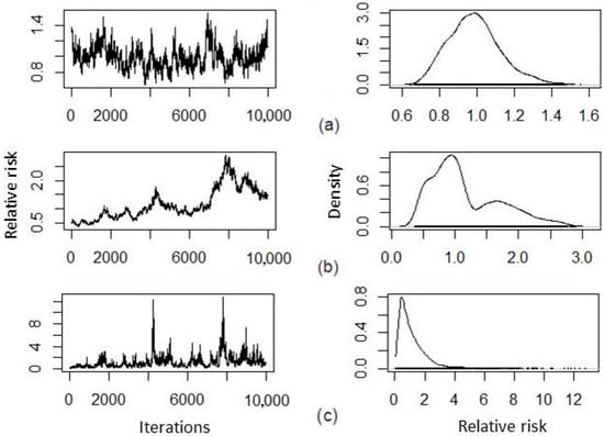 Poisson models are typically presented as relative risks. In this study, the relative risk for a unit increase from a covariate with parameter is presented by the transformation exp(). Therefore, a 5% increased risk can be shown by a relative risk of 1.05. The left side of Figure 10 shows the trace-plots and the right demonstrates the posterior relative risk distributions of a one unit increase for some chosen variables. As demonstrated from the sub-figures, the relative risk from all three different factors shows a different pattern. The trace-plots show that the relative risk from EI is very consistent within a narrow range around one (no impact) during the iteration process, while the relative risk from forest fluctuates significantly, but most values are close to zero, which is also reflected by the density estimates.