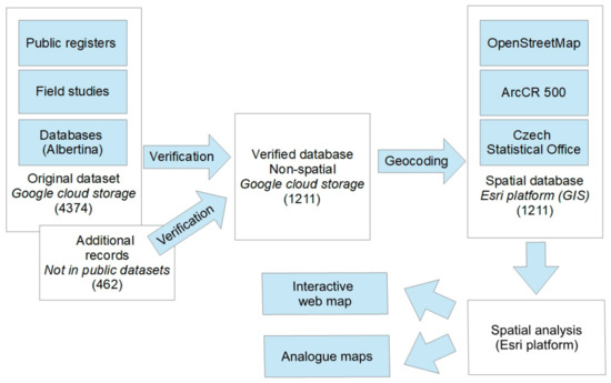 The primary dataset was collected from the Albertina database tracking list. The subjects were selected according to the prevailing activity in the CZ NACE [EU standardized classification of economic subjects; NACE = Nomenclature statistique des activités économiques dans la communauté Européenne], which is the activity involving the overwhelming majority of the company’s turnover. A database with a total of 4,374 records was created from some of the data obtained. However, the NACE codes contained only very general specifications, and some entities had no link to cultural or creative industries or were not active. Because of these deficiencies in public registers, many mapping entities had to be excluded. After filtering inappropriate subjects, the data were verified by contacting individual entities and confirming the information about their activities. During the project, the data were supplemented by another 462 records not registered under the appropriate codes in the public registers. The raw data needed to be modified for processing in GIS. The data in the original tabular form had to be converted into spatial data in a standardized vector format (Esri shapefile). This represented the acquisition of postal addresses for all individual entities, followed by geocoding and transformation in specialized software, ArcGIS (see Figure 1).