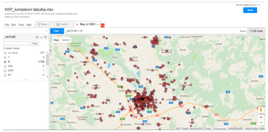 Data containing information about entities were originally tabular (Google Docs storage: Google Tables) and it was not possible to work with such stored data in a GIS. It was therefore necessary to convert the data into spatial vector data, i.e., the Esri shapefile format. In order to assign a location to entities, several methods are possible, the most commonly used being geocoding of addresses or direct localization by coordinates. Because the tabular data already had address and city attributes, geocoding was selected. According to Longley et al. [3], geocoding, or addressing, is a term for assigning accurate positioning to entities based on address information or coordinates in a particular coordinate system, typically latitude and longitude. The geocoding process is absolutely necessary for any further work in a GIS. It is important to note the instability of the geocoding system over time. Renaming and replacing of phenomena may result in errors [3]. Today, a number of methods allow objects to be located in space by geocoding addresses, but the complete address must be in one column. For this reason, the first data processing step was to create a new, full column in order to geocode the subjects. Google Fusion Tables was selected for the geocoding process, primarily because of the Google Docs cloud environment. Google Fusion Tables is an online tool which allows geocoding in a user-friendly way— the address column type only needs to be modified to “Location” and then the full address column in the “Map of” tab selected (Figure 2). The only drawback of this solution is the limited export of spatial data formats. For this reason, it was necessary to make another intermediate step. The geocoded data were saved in KML and converted into the Esri shapefile format with all attributes using the ArcGIS Desktop v10.5 specialized software and then modified for further GIS processing.