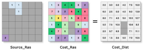Cost-weighted distance (Cost_Dist) calculation: distance (Source_Ras) is multiplied by the frictional value (Cost_Ras) [25].