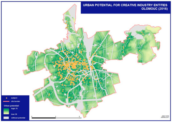 Urban Planner is an analytical extension of the ArcGIS for Desktop software and used to evaluate the territorial potential and identify optimal areas for territorial development based on multi-criteria analyses. It uses territorial analytical data as input. Based on an assessment of the territorial potential using set values, pillar weight, and various other factors and phenomena, areas with the potential for further development can be effectively visualized [26]. The Urban Planner extension was tested primarily for the purpose of verifying the ability to identify sites with the potential for developing creative industries. This testing was carried out on the city of Olomouc using territorial analytical data provided by the Olomouc municipality. Urban Planner was a very useful tool for mapping creative industries to implement in a GIS.