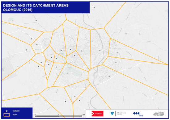 Another applied GIS method was defining the service areas of subjects in creative industries by Voronoi polygons (also called Thiessen polygons). Voronoi polygons are defined as polygons that contain just one service point. The other points inside the polygon are closer to this measured point than any other point measured [28]. The only parameter for defining the service areas of individual entities is therefore only the direct distance from an entity not including any road network or obstacles in the field. For this reason, it is better to use spatial analysis or other analysis involving the calculation of at least the road network (see the abovementioned Accumulated Cost Surface method, Section 3.3.3.). Despite these shortcomings, Voronoi polygons demonstrated to be a suitable solution for easy and clear visualization of the approximate gradient zones of individual subjects (Figure 5). Based on the size of the resulting polygons, sites with large or possibly small coverage can be clearly identified. For greater clarity in outputs, service areas were defined for each of twelve sectors separately.