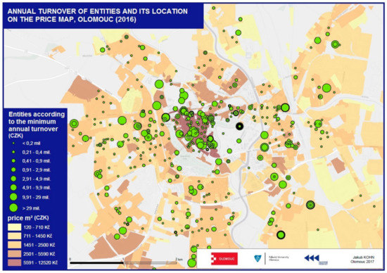 Very useful cartographic work for the mapping team was mapping subjects on an Olomouc price map (Figure 8). This map shows individual entities using the cartographic method of the city map with point characters. The Olomouc price list was provided directly by the City Council of Olomouc. The same cartographic method can be used to create a population density map for the occurrence of subjects. More scientific conclusions will be published in following research (see Conclusion). So far, some correlations can be observed: location in the historical center or nearby public facilities (such as shopping malls), land price, and transport accessibility. It is evident that entities are dominantly located nearby the city center. The fundamental reason regards the position of the historical center where markets and storage are traditionally located.
