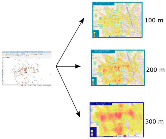 According to the mapping team’s requirements, heat maps depicting the density of deployment of cultural and creative industries in Olomouc were also developed. Heat maps are a specific type of dasymetric method and represent a very popular means of visualizing point-location depictions which are widely used, for example, in marketing [30]. However, it is very important to set the radius of the calculation for clustering. If the input parameters are not appropriate, the final result may be very misleading [31]. Maps with a radius of 100, 200, and 300 meters were created (Figure 7). When comparing these maps, the most promising results showed an output with a radius of 200 meters.