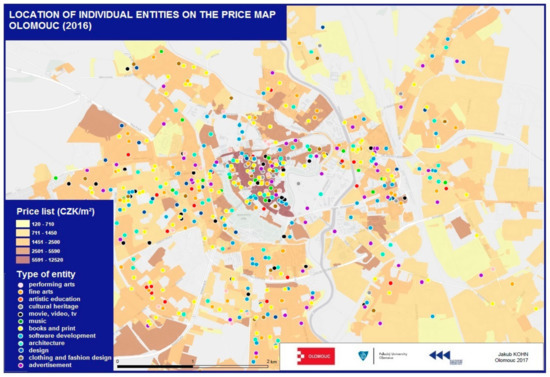 Under implementation of the GIS, socio-economic aspects influencing creative industry activities were visualized, and sites with the potential for the development of creative industries were delineated. In dealing with this step, the most challenging part was identifying the phenomena affecting a creative industry’s activities examined in this work. The most important phenomena were population density (Figure 9) and transport availability. Two main findings can be observed: (1) the majority of active cultural and creative industry subjects work in a regional city or its immediate vicinity; and (2), as shown by their location depicted on the city’s price map, entities have a strong tendency to concentrate in the city center or areas in the city with higher prices and service levels. The reason for this is that higher price areas are more developed with higher infrastructure levels (typically business parks, shopping malls, and surroundings). Strong evidence for this can also be found in smaller towns such as Litovel, Šternberk, and Uničov.