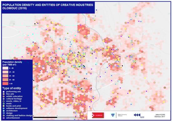 This is why a unique initiative to map cultural and creative industries in Central Europe was set-up at Palacký University Olomouc. With a clear definition of culture, representatives of the university, city, and region will have concrete information about the impact of cultural industries in the region. It will allow them to set the parameters for further development of culture (subsidies or adjustments to study fields) and may be a source of technological/non-technological innovation or a reason for movement in the workforce. This article built on the conclusions of a multidisciplinary collaboration of experts in technical (cartography, IT) and humanities (economics, cultural sciences, art) fields. Its aim was to describe the possibilities of implementing geographical information systems in the field of creative industries. The analyses and map outputs provide a clear overview of the spatial definition of cultural and creative industries including the main aspects which influence their pursuits. These aspects could not be identified without geographical information systems. This article hypothesized that the interconnection of creative industries with cartographic instruments significantly increases the competitiveness and use of acquired knowledge. It does not aim to describe the process of creating maps (i.e., a how-to manual) but explains the unique principle of joining both disciplines. It discusses possible analyses and benefits stemming from interdisciplinary cooperation in areas not yet deeply explored. The main goal of this article was the creation of suitable map visualizations (the current state) and spatial-based identification (the potential for development). We did not aim at advanced spatial analysis.