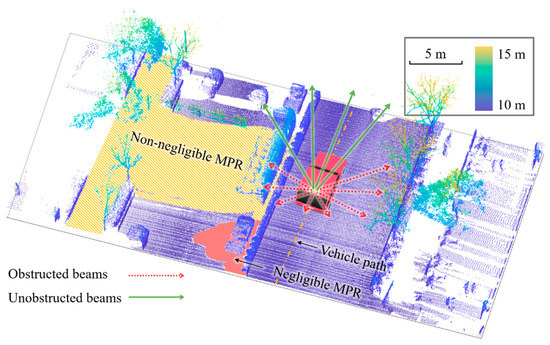 Whether an MPR causes non-negligible data gaps depends on its features (e.g., location, area, orientation). These features are associated with the obstacle attributes (e.g., position, dimension, speed of mobile vehicles in the traffic) at the time of capturing the points. Stationary obstructions are constantly fixed at their positions, so their impacts on MPR generation are relatively predictable. However, the traffic condition around the inspection vehicle at the data collection stage is hard to control, especially in busy cities, making the distribution of MPR along the road corridor difficult to predict. Therefore, it is meaningful to detect MPR in MLS data, which is a prerequisite for checking whether the road information loss (RIL) in the dataset is substantial.