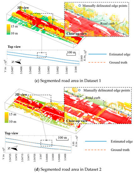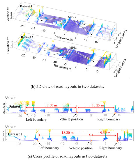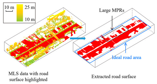 Some issues remain to be addressed in future research. The developed approach relies on vehicle trajectory data. In this study, the measuring vehicle traces the road axis carefully by remaining in the same lane during data collection, but there is a possibility that the vehicle must shift to another lane for turning or passing maneuvers. In these cases, the extracted ROI may not be exactly the road area. Further research to estimate the adverse effect of using vehicle path as a substitute for the road axis is needed. Also, the proposed method extracted the road area from the MLS point cloud using the scan-angle thresholds, while in some MMS, more than one laser scanners are used (e.g., Trimble MX-9), which may degrade the accuracy of the extracted road area. A more robust method for delineating the road area in MLS data for MPR detections is expected to be developed in the future.
