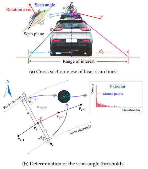 20]. Some studies slice the cross-section profiles that are perpendicular to the vehicle path in MLS data and then extract the road surface using similar rules to the scanline methods [