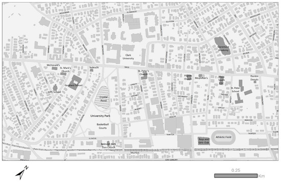 The study area, only 1.4 km2, extends through one of the most densely populated residential sections of the city. The main land-use types in the area are multi-family residential, commercial (small shops and eateries), and recreational (University Park). The area also includes Clark University and four schools. The majority of residents are Latino and African American, and the neighborhood’s poverty rate is more than double that of the city as a whole. In 2010, the total population of the area was 3841 [30].