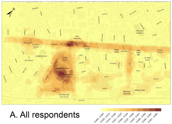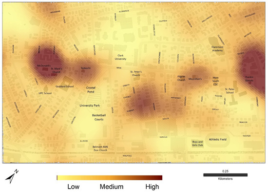 When all surveys are overlaid with the crime density map, two large areas of “mismatch” between the recorded crime and safety perception appear—one on the western side, near McDonald’s, and the other near the eastern edge of the study area near Dunkin Donuts (Figure 4a). Residents did not perceive these two areas of the highest crime density as unsafe. The opposite pattern presents in the University Park and on Main Street near Clark University; in these areas, the perception of being unsafe is high but recorded crime level is low.
