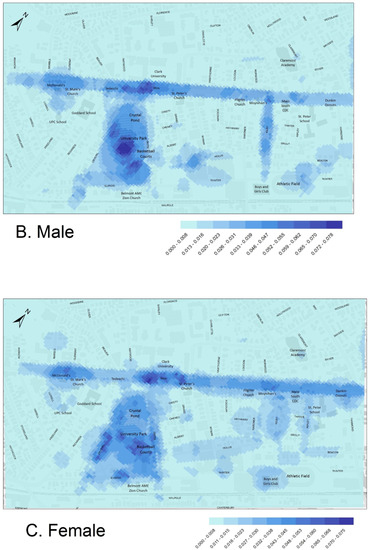Two male and female perception maps show similar patterns overall (Figure 3b,c), but when they are reclassified into three categories, subtle differences between them begin to emerge—for example, male respondents marked a larger area within University Park as “high crime” than did female respondents. Furthermore, Kilby Street fell into the “medium crime” category on male maps, whereas it was classified as “low crime” on female maps. It is possible that males have stronger fear of that street because it is associated with the Kilby Street gang. (Figure S1c,d, Supplementary Materials).