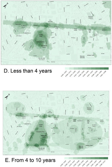 When perceptions are mapped based on length of residency in the neighborhood, different patterns emerge. For example, residents who have been in the area less than four years marked more areas as unsafe compared to residents who have lived there longer. The “less than 4 years” map shows the entire Main Street and the entire University Park as medium or highly unsafe (Figure S1e, Supplementary Materials). It is interesting to note that the residents who lived 4–10 years in the area marked fewer unsafe areas on their sketch maps, than the people who lived there 10+ years (Figure S1f,g, Supplementary Materials).
