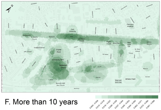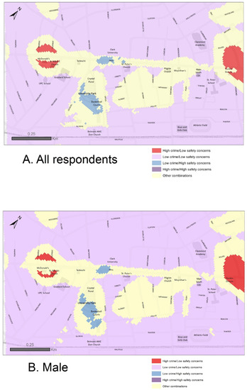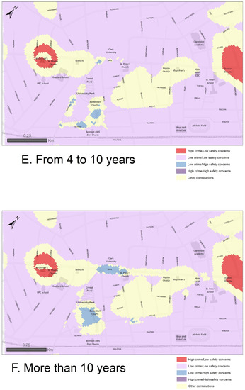 Overlay maps for male and female respondents are similar (Figure 4b,c), with the exception of a small area near St. Peter’s Church, which was categorized as “low crime, high safety concerns” only on the female map. In the University Park area, the spatial mismatch between crime and safety concerns is more pronounced for male respondents. Of the three overlay maps related to the length of residency, only one showed spatial match between areas of high reported crime and high safety concerns, that is, for residents who lived 4 years or less in the neighborhood (Figure 4d). Residents who lived in the neighborhood longer than 4 years perceived these areas as medium or low safety concerns (Figure 4e,f). On the other hand, areas of spatial mismatch (low crime perceived as high crime concerns) occupy the largest area on two maps, that is, for respondents who lived in the neighborhood less than 4 years, but also more than 10 years (Figure 4d,f).