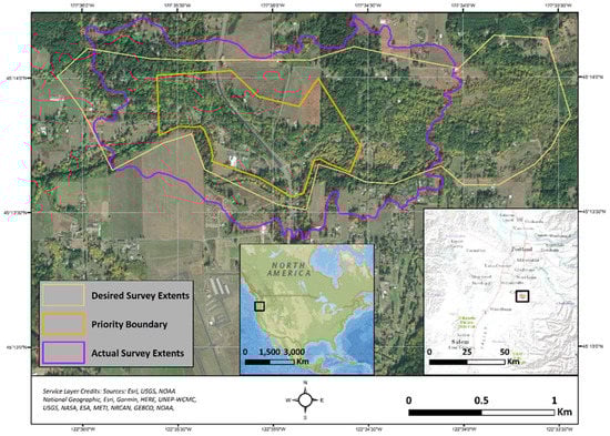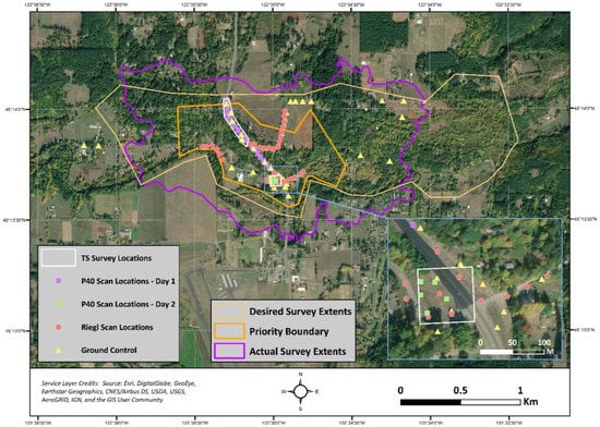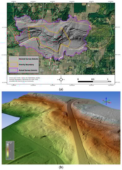 The study area (Figure 1) encompasses an active landslide complex in Mulino, Oregon, USA approximately 22 miles southeast of the city of Portland. The Oregon Department of Transportation (ODOT) is interested in this site due to its slow and steady change over time, which is the primary reason it was chosen as a site to test the capabilities of ULS, with the real-world application of change detection as a backdrop. Additionally, the site is an ideal candidate for testing ULS data due to its variation in topography and landcover. With a paved highway running through the center of it, the area of interest (AOI) also contains relatively high relief and areas with varying degrees of vegetation, ranging from open fields to moderately dense forests, with a mix of both coniferous and deciduous trees. The “desired survey extents” boundary in Figure 1 represents the entire AOI set as an overall objective (if time permitted) before data collection began, while the “priority boundary” represents the area of a specific landslide, which was the main focus in the landslide complex. Due to time constraints, however, the “actual survey extents” show what was actually surveyed over the two-day campaign.
