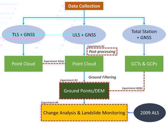 - Experiment #4—Change analysis. The chosen study area provides an excellent opportunity to perform a practical assessment of ULS accuracy and quality through change detection and analysis. Historical ALS data from 2009 serves as a topographic baseline to compare the more recently acquired ULS data against. This comparison was performed by direct cell-to-cell subtraction of the bare earth DEMs of the respective epochs. The purpose of this experiment was twofold: (1) To assess topographic change in the area as part of ongoing monitoring of an active landslide complex, and (2) to ascertain whethre ULS data can provide high enough spatial detail and accuracy for change analysis to be successful and provide important information on landslide kinematics.