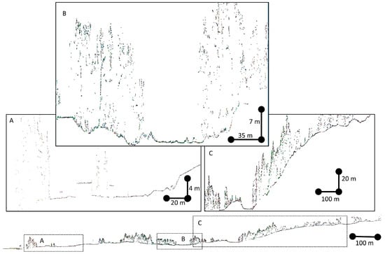 Following this operation, a preliminary DEM was created as a Delaunay triangulation of the centroids of all ground points located within each cell. Only points within 5 cm of this model were then given a final classification as ground and everything else was unclassified. Next, minor manual cleanup was performed at locations such as the edges of the study area where the ground filter did not work as well. A final DEM (Figure 5) was created as the rasterization of the average Z coordinates of all of the ground points within each cell. This process helps minimize noise in the final model through the averaging process. In the end, a 0.5 m bare earth DEM was produced. This overall ground filtering process was iteratively refined in order to find the optimal cell size for this particular study area. While other studies have achieved higher resolution DEMs with ULS, it can be challenging to capture sufficient ground points in the dense forests on steep terrain, which is common in the Pacific Northwest of North America. Other studies achieving higher resolution results focus on smaller study areas, less terrain relief, and/or have much less tree canopy and lower story vegetation overall.