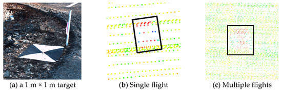Example of (a) a 1 m × 1 m target, and point clouds from (b) a single flight, and (c) multiple flights combined. The point colors represent intensity ranging from low (red) to moderate (green) to high (blue).
