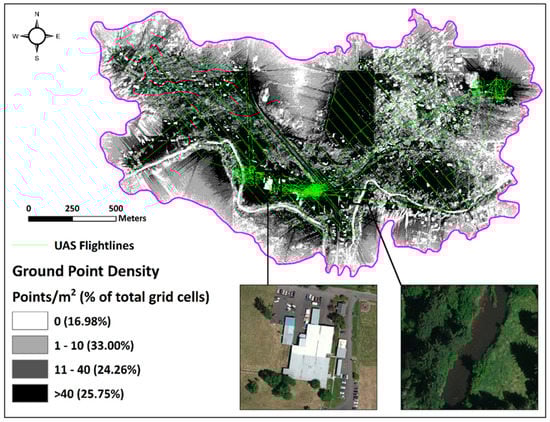 - Experiment #3—Point density assessment. The third experiment provides a detailed analysis of how well ULS captures and represents the ground surface through statistical analysis of the ground point density and coverage within the study area. This assessment is performed by computing summary statistics of ground points on a cell-by-cell basis within a 1 m × 1 m grid cell. Evaluation of the ground point density is a common assessment of lidar data quality as it often relates to a higher accuracy and increased ability to discern captured features in the topography.
