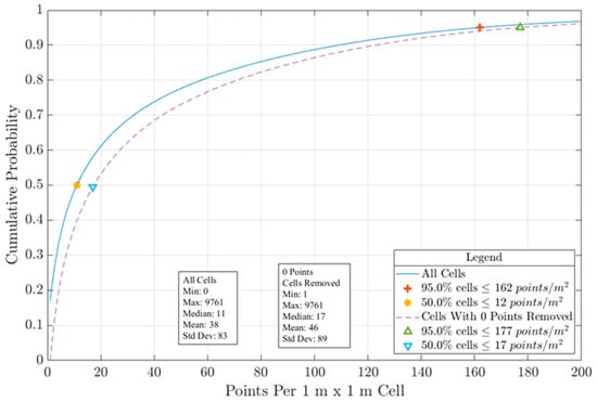 Figure 11 presents a cumulative probability plot of the project area’s point density along with the summary statistics. The high standard deviation can be explained by the large disparity in the ground point density between take-off sites and the remainder of the project area. This results in an incredibly irregular spread of points throughout the site; although this spread is to be expected with ULS data because of constraints in the flight time and the limited locations used for take-off sites. For this project’s acquisition, the size and geography of the site restricted where the ULS could take-off, and limited battery supply also contributed to numerous swaths crossing over the same area, thus creating a disproportionately high point count around the take-off sites. As far as overall coverage is concerned, however, the ULS performed well, as seen in the computed median (11 ground points/m2) and the cumulative probability graph. This graph shows that when disregarding grid cells with zero ground returns, the ULS successfully mapped 50% of all remaining grid cells with at least 17 ground points/m2. Ground density was considered this way because, as mentioned earlier, it is quite common to have numerous areas of zero ground returns when buildings, water, and dense vegetation are present, all three of which can be found at this site.