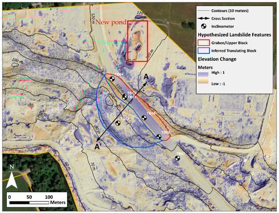 Change detection DEM between original ALS data and ULS data showing erosion/subsidence (red) and accretion/heave (blue). The inferred landslide extents are shown in a red polygon (graben) and blue polygon (translating block). Borings with inclinometers are labeled and represent traditional geotechnical monitoring supplemented by repeat collection of UAS lidar.