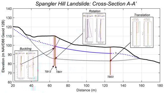 Inferred cross-sectional geometry of landslide mass from inclinometer readings and change analysis. On the left, buckling may be observed in the subsurface deformation profile measured from inclinometer TB13, coinciding with measured subsidence observed from change analysis of DEMs, which reflects a decrease in elevation. On the right, translation is observed in the subsurface soil profile, reflected in limited change on the bench between relative landslide distance of 80 and 140 m, but measured surficial accretion from change analysis of DEMs between approximately 140 and 160 m of relative landslide distance. Change analysis of DEMs conceptually demonstrates similar kinematics of landslide movement observed in subsurface monitoring of the landslide mass and helps supplement the relatively sparse in-situ monitoring sensors.