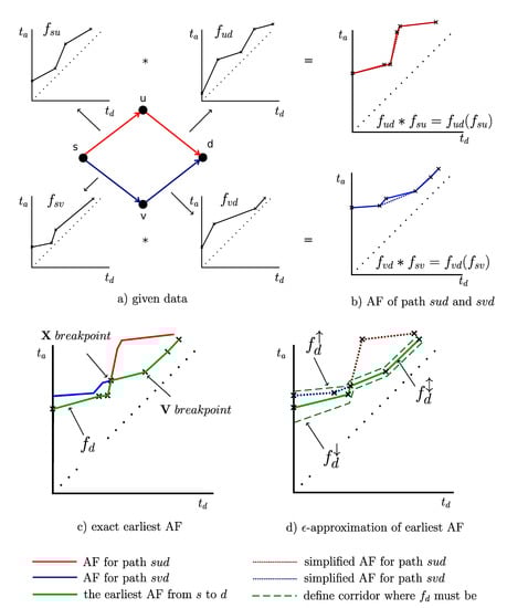 These methods recognize two types of breakpoints. The V points represent points that are created as images of the breakpoints that lie on the edge arrival functions . The X points are created as an intersection of two AF in the operation. It can be proven that the AF between two consecutive V points is concave or a line segment [] (see example in Figure 1c). The algorithms described in [,] use this concavity. First, the V points are computed using one backward probe and two forward probes (more in []), and then the approximation of AF between the V points is determined. The main problem of this approach is that the computation of V points requires probes [].