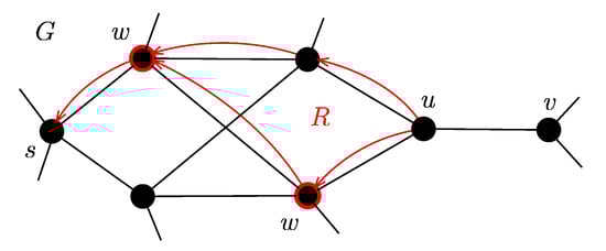 In Figure 2 there is an example of backsearch. The black color represents the original graph G and the red color represents the acyclic graph R. The edge violates the condition (2). Then the algorithm starts backSearch procedure and finds the set W (red nodes) using the graph R.
