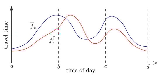 Let be a directed graph that represents a road network, where V is a set of nodes and E is a set of edges. Each edge has an arrival function (AF) that for the given departure time at u returns the arrival time at v. Alternatively, we can define a travel time function (TTF) that returns the time needed to cross the edge. A relationship between the TTF g and the corresponding AF f is defined as .