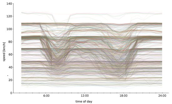 The question is how to split the departure time interval so that the computation is the most effective. In Figure 4 there is a visualization of speed profiles for the testing dataset. The x-axis represents a time of day and the y-axis displays the average speed in time on edges. In the visualization, all speed profiles from the tested dataset are rendered in various colors. As you can see, the fluctuation in the night time (the first part and the last part) is small. There are two main concepts for splitting:
