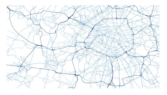 The real road network with real speed profiles that were computed from GPS tracks was used for testing. These data represent part of Paris (Figure 5). Compared to [], the speed profiles’ preprocessing was improved so the measured results are a little bit different.