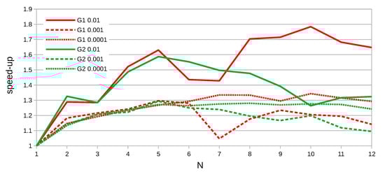 The first test is focused on equal subintervals. The original departure time interval was divided into 2–12 subintervals. The two datasets (G1 and G2) were used and the maximum relative error was set to , , and . The more effective simplification method by Imai and Iri was set for all tests in this section. The test was performed only in serial (one thread was used only). In Figure 7 there are results of the test. The chart shows the dependence between the speed-up and the number of subintervals. The speed-up is defined as: