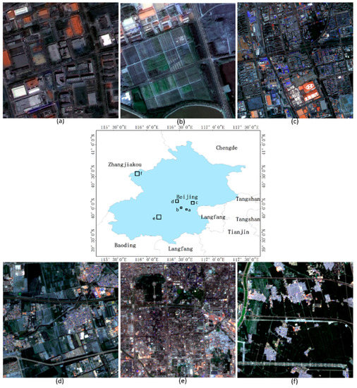 The feasibility of the proposed image segmentation method was evaluated using six GF-1 images of Beijing, China. As shown in Figure 1, all the images are 400 × 400 pixels. Furthermore, the spectral information of the first two images was enhanced by image fusion technology using the NNDiffuse Pan Sharpening function of software ENVI 5.2 to fuse the 2 m panchromatic images and 8 m multispectral images. The original images have a spatial resolution of 2 m but are panchromatic with no multispectral features. The images with a spatial resolution of 8 m are multispectral. To make full use of the spatial information and spectral information of the GF-1 images, we fused the information to form a multispectral image with a spatial resolution of 2 m.