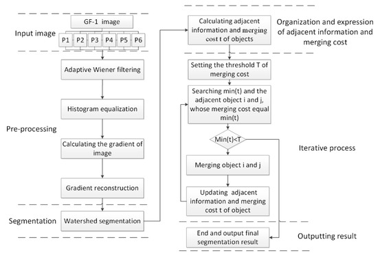 In this section, an improved remote sensing image segmentation method is proposed, as illustrated in Figure 2. The method is a two-stage technique: In the first stage, the watershed algorithm based on pre-processing was used to obtain a preliminary segmentation result and in the second stage, the fast lambda-schedule algorithm based on the common boundary length penalty was used to further merge small segments of the preliminary segmentation to avoid over-segmentation in textured areas. The improved watershed algorithm and fast lambda-schedule algorithm are described in Section 2.4.1 and Section 2.4.2, respectively.