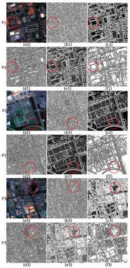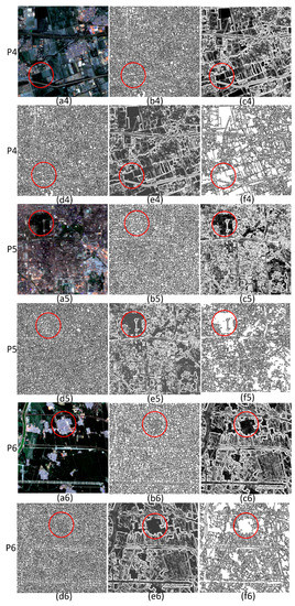 The first two test images (P1 and P2) have a spatial resolution of 2 m. P1 covers an urban region with a number of buildings, and P2 covers a typical suburban region with a mix of buildings, roads, farmlands, and unused-land. The next two test images (P3 and P4) have a spatial resolution of 8 m. P3 and P4 cover typical urban and suburban regions, respectively. The last two test images (P5 and P6) have a spatial resolution of 16 m. P5 covers an urban region, and P6 covers a suburban region.