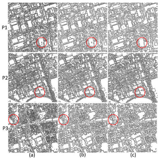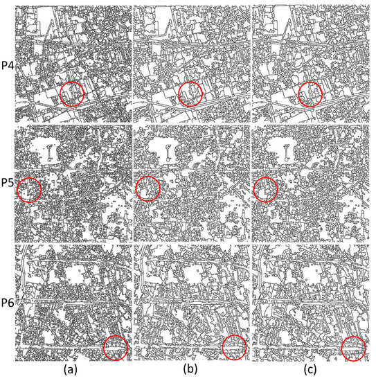 The segmentation results (P4, P5 and P6) with different fast lambda-schedule processing: (a) Preliminary segmentation (watershed with the gradient-reconstructed), (b) Merging with the fast lambda-schedule, and (c) Merging with the improved fast lambda-schedule.
