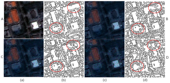 Segmentation results with different speckle noise: (a,c) small 200×200 pixel image samples selected from the P1 image (A: image without speckle noise, B: image corrupted by speckle noise with variance = 0.01, C: image corrupted by speckle noise with variance = 0.03, and D: image corrupted by speckle noise with variance = 0.05); (b,d) the corresponding segmentation results.