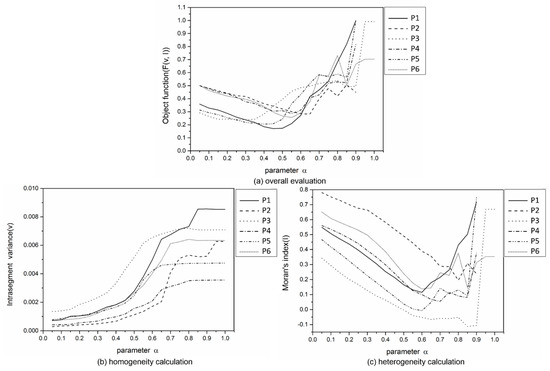 According to the abovementioned optimal (α, g) scales, this paper obtained six satisfactory preliminary segmentation results. Then, sensitivity experiments for parameter in the improved fast lambda-schedule were conducted based on the six preliminary segmentation results with λ defaulted to 1, as shown in Figure 11. The intra-segment variance (v) increased as increased (Figure 11b), whereas Moran’s index (I) first decreased and then increased, but the change was not substantial (Figure 11c). To obtain good merging results, the settings that produced the lowest F (v, I) were selected as the optimal scales of for the six test images. According to Figure 11a, was set to 0.4, 0.3, 0.2, 0.35, 0.25, and 0.45 for the six test images, respectively.