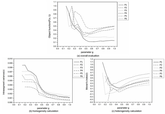 The evaluation results of improved watershed segmentation with different parameter g settings in the six test images based on the optimal α: (a) Objective function (F (v, I)), (b) intra-segment variance (v), and (c) Moran’s index (I).