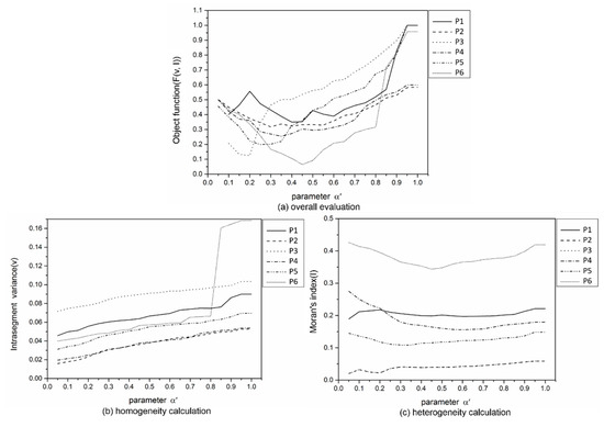 The evaluation results of improved fast lambda-schedule segmentation with different parameter α′ settings in the six test images when λ defaults to 1: (a) Objective function (F (v, I)), (b) Intra-segment variance (v), and (c) Moran’s index (I).