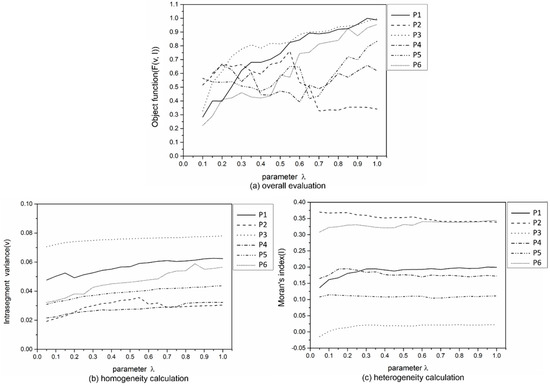 Then, the parameter λ sensitivity was analyzed based on the optimal parameter , and the evaluation results of the improved fast lambda-schedule are shown in Figure 12. The intra-segment variance (v) increased with increasing λ (Figure 12b); however, the Moran’s index showed no obvious trend for the six test images (Figure 12c). The optimal scales of parameter λ were selected by means of the same strategy as for parameter α′. The λ values were set to 0.1, 0.7, 0.1, 0.6, 0.65, and 0.1 for the six test images, respectively.