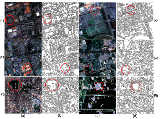 According to the parameter sensitivity analysis, this paper applied the optimal (α, g) of (0.25, 0.85), (0.3, 0.75), (0.15, 0.8), (0.25, 0.8), (0.2, 0.8), and (0.25, 0.75) and the optimal (, λ) of (0.4, 0.1), (0.3, 0.7), (0.2, 0.1), (0.35, 0.6), (0.25, 0.65), and (0.45, 0.1) for the six test images, respectively. The segmentation results are shown in Figure 13. Most ground objects featured complete structures and clear contours, with clear and smooth edges without considerable noise and discontinuity. The segmentation results for natural objects, such as trees and farmland, contained a small number of fragments and noise; however, for typical urban objects, such as buildings and roads, the segmentation results were relatively complete and suitable for visual perception.