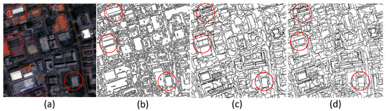 The proposed method achieved a lower F (v, I) than the other two methods, indicating that our method had better overall performance. However, the v values obtained by the proposed method were lower than those obtained by multiresolution segmentation, but much higher than those obtained by spectral difference segmentation; thus, the homogeneity achieved by the proposed method was better than that achieved by multiresolution segmentation but worse than that achieved by spectral difference segmentation. The proposed method achieved the lowest I value, indicating that our method’s heterogeneity was the best. For the segmentation of man-made objects, such as buildings, the proposed method achieved the best performance, as shown in Figure 14.