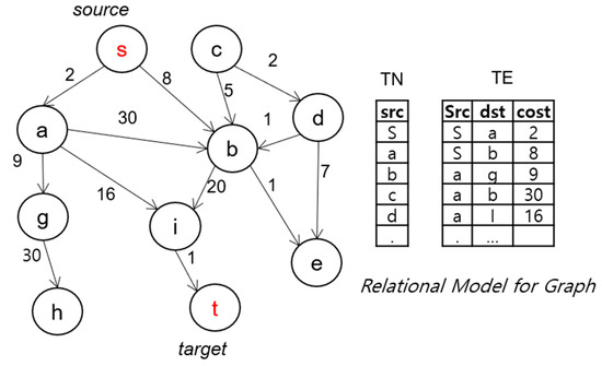 Many studies on the application of graph-related algorithms using relational databases have been performed. Relational databases have been developed for over 40 years. The technology has developed enough to handle graph data for data storage, buffering, indexing, and optimization [2,3]. Of these studies, recent research on the shortest-path problem has made much progress. The shortest-path search algorithms in a graph are mainly divided into single-source shortest-path algorithms, which find the shortest path from one starting node to another node, and all-pairs shortest-path algorithms, which find the shortest path between all nodes. Gao et al. [2] is a typical relational database-based single-source shortest-path search method. In addition, De Leo and Boncz [5] developed SQL-based code that supports the shortest path in MonetDB, an open-source relational database, and Greco et al. [6] proposed a method for the all-pairs shortest-path problem for variable graph data using a relational database.