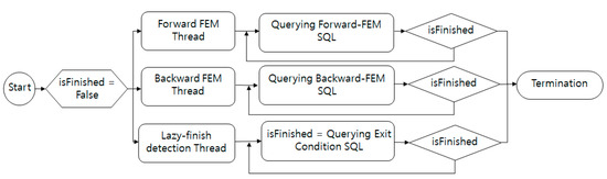 As shown in Figure 5, the three threads play independent roles. The forward and backward FEM threads perform the search in each direction independently through repeated SQL commands. The lazy-finish detection thread that oversees the execution of these two threads controls the isFinished variable.