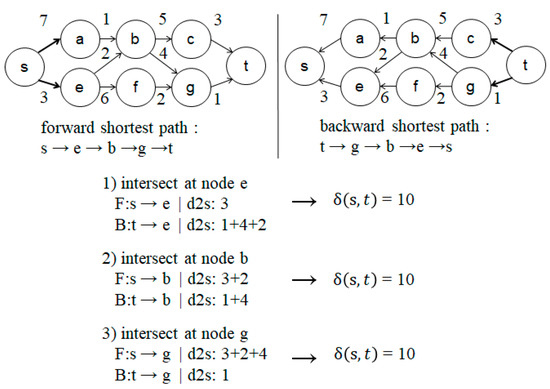 An example is shown in Figure 6 where the proposed method performs the forward search starting from node s and the backward search starting from node t. Once the searches in both directions find the same node, the termination condition is checked. When the paths intersect at node e, the forward search has path s → e and the reverse search has path t → g → b → e. The shortest path, that is, s → e → b → g → t, is determined by adding the result of the forward search to the result of the backward search in reverse order. Here, the weight is 10, which is the result of adding the forward search value (3) and the backward search value (7).